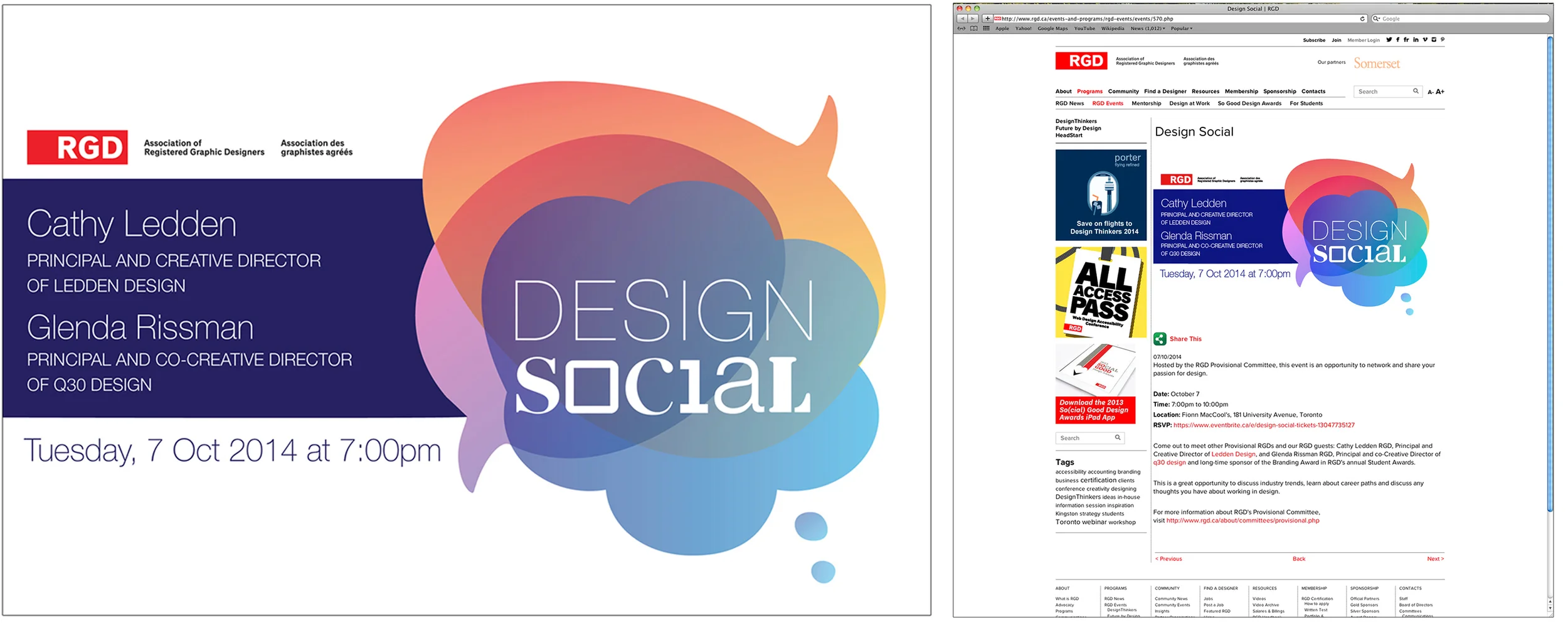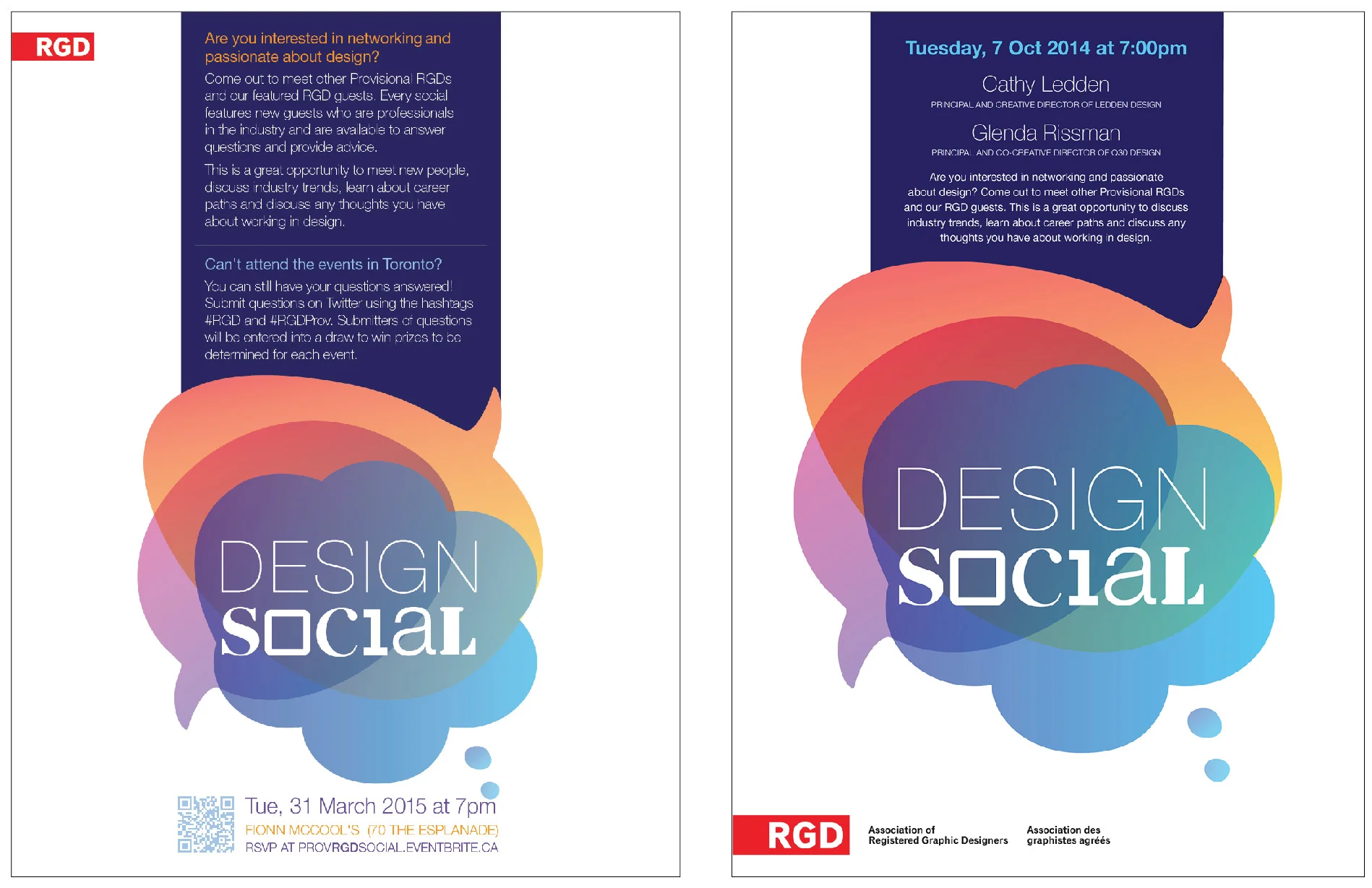 Being a part of the RGD Provisional committee, we launched an on-going event series that gives members an opportunity to network and share their common passion for design. Each event also has a couple of experienced designers guest (RGDs), who provisional members can mingle with and ask questions. After agreeing on a name, I designed an identity for the event, as well as promotional materials including posters and thumbnails.