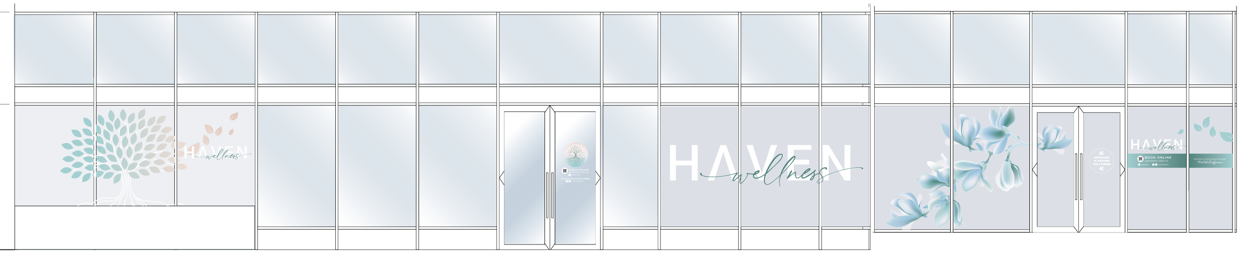 Translating the identity into the physical space was a priority to ensure it harmonized with the interior design. A critical challenge was the clinic’s location—a corner unit that required a delicate balance between allowing natural light into service rooms and maintaining patient privacy. We designed custom privacy window graphics printed on frosted vinyl, transforming a functional necessity into a beautiful, on-brand art feature that attracts passersby while shielding clients. We further extended the physical branding by exploring designs for blade signage and staff uniforms, ensuring a professional consistency throughout the client experience.