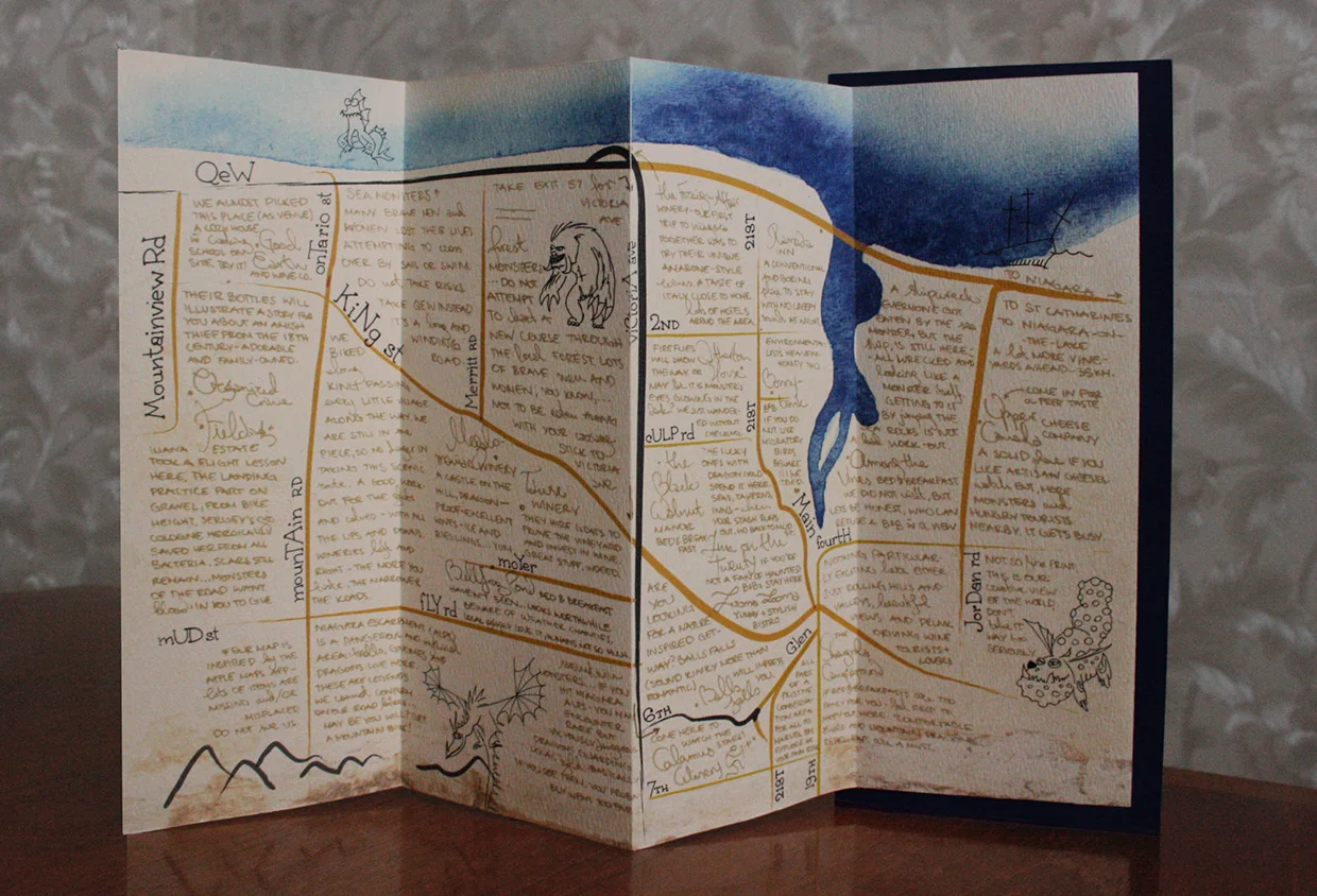 Our hand-written invitation was a humorous map. It retraced our endeavours to entertain people and inspire them to look around. We pointed out numerous local attractions, such as bed&breakfasts, a cheese company, wineries, restaurants, parks, etc.